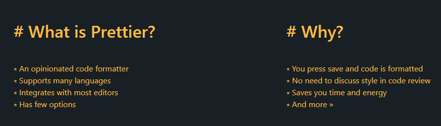 prettier 요약하자면 전체적인 코드 스타일을 일관성있게 유지하도록 해주는 포맷팅 툴이다.