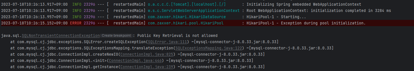 springboot console log 2023-07-18T10:26:15.152+09:00 ERROR 23296 --- [ restartedMain] com.zaxxer.hikari.pool.HikariPool : HikariPool-1 - Exception during pool initialization. java.sql.SQLNonTransientConnectionException: Public Key Retrieval is not allowed at com.mysql.cj.jdbc.exceptions.SQLError.createSQLException(SQLError.java:111) ~[mysql-connector-j-8.0.33.jar:8.0.33] at com.mysql.cj.jdbc.exceptions.SQLExceptionsMapping.translateException(SQLExceptionsMapping.java:122) ~[mysql-connector-j-8.0.33.jar:8.0.33] at com.mysql.cj.jdbc.ConnectionImpl.createNewIO(ConnectionImpl.java:825) ~[mysql-connector-j-8.0.33.jar:8.0.33] at com.mysql.cj.jdbc.ConnectionImpl.<init>(ConnectionImpl.java:446) ~[mysql-connector-j-8.0.33.jar:8.0.33] at com.mysql.cj.jdbc.ConnectionImpl.getInstance(ConnectionImpl.java:239) ~[mysql-connector-j-8.0.33.jar:8.0.33] at com.mysql.cj.jdbc.NonRegisteringDriver.connect(NonRegisteringDriver.java:188) ~[mysql-connector-j-8.0.33.jar:8.0.33] at com.zaxxer.hikari.util.DriverDataSource.getConnection(DriverDataSource.java:138) ~[HikariCP-5.0.1.jar:na] at com.zaxxer.hikari.pool.PoolBase.newConnection(PoolBase.java:359) ~[HikariCP-5.0.1.jar:na] at com.zaxxer.hikari.pool.PoolBase.newPoolEntry(PoolBase.java:201) ~[HikariCP-5.0.1.jar:na] at com.zaxxer.hikari.pool.HikariPool.createPoolEntry(HikariPool.java:470) ~[HikariCP-5.0.1.jar:na] at com.zaxxer.hikari.pool.HikariPool.checkFailFast(HikariPool.java:561) ~[HikariCP-5.0.1.jar:na] at com.zaxxer.hikari.pool.HikariPool.<init>(HikariPool.java:100) ~[HikariCP-5.0.1.jar:na] at com.zaxxer.hikari.HikariDataSource.getConnection(HikariDataSource.java:112) ~[HikariCP-5.0.1.jar:na] at org.springframework.boot.autoconfigure.h2.H2ConsoleAutoConfiguration.getConnectionUrl(H2ConsoleAutoConfiguration.java:94) ~[spring-boot-autoconfigure-3.0.6.jar:3.0.6] at java.base/java.util.stream.ReferencePipeline$3$1.accept(ReferencePipeline.java:197) ~[na:na] at java.base/java.util.ArrayList.forEach(ArrayList.java:1511) ~[na:na] at java.base/java.util.stream.SortedOps$RefSortingSink.end(SortedOps.java:395) ~[na:na] at java.base/java.util.stream.Sink$ChainedReference.end(Sink.java:258) ~[na:na] at java.base/java.util.stream.Sink$ChainedReference.end(Sink.java:258) ~[na:na] at java.base/java.util.stream.AbstractPipeline.copyInto(AbstractPipeline.java:510) ~[na:na] at java.base/java.util.stream.AbstractPipeline.wrapAndCopyInto(AbstractPipeline.java:499) ~[na:na] at java.base/java.util.stream.AbstractPipeline.evaluate(AbstractPipeline.java:575) ~[na:na] at java.base/java.util.stream.AbstractPipeline.evaluateToArrayNode(AbstractPipeline.java:260) ~[na:na] at java.base/java.util.stream.ReferencePipeline.toArray(ReferencePipeline.java:616) ~[na:na] at java.base/java.util.stream.ReferencePipeline.toArray(ReferencePipeline.java:622) ~[na:na] at java.base/java.util.stream.ReferencePipeline.toList(ReferencePipeline.java:627) ~[na:na] at org.springframework.boot.autoconfigure.h2.H2ConsoleAutoConfiguration.logDataSources(H2ConsoleAutoConfiguration.java:86) ~[spring-boot-autoconfigure-3.0.6.jar:3.0.6] at org.springframework.boot.autoconfigure.h2.H2ConsoleAutoConfiguration.lambda$h2Console$0(H2ConsoleAutoConfiguration.java:69) ~[spring-boot-autoconfigure-3.0.6.jar:3.0.6] at org.springframework.boot.autoconfigure.h2.H2ConsoleAutoConfiguration.withThreadContextClassLoader(H2ConsoleAutoConfiguration.java:78) ~[spring-boot-autoconfigure-3.0.6.jar:3.0.6] at org.springframework.boot.autoconfigure.h2.H2ConsoleAutoConfiguration.h2Console(H2ConsoleAutoConfiguration.java:69) ~[spring-boot-autoconfigure-3.0.6.jar:3.0.6] at java.base/jdk.internal.reflect.NativeMethodAccessorImpl.invoke0(Native Method) ~[na:na] at java.base/jdk.internal.reflect.NativeMethodAccessorImpl.invoke(NativeMethodAccessorImpl.java:77) ~[na:na] at java.base/jdk.internal.reflect.DelegatingMethodAccessorImpl.invoke(DelegatingMethodAccessorImpl.java:43) ~[na:na] at java.base/java.lang.reflect.Method.invoke(Method.java:568) ~[na:na] at org.springframework.beans.factory.support.SimpleInstantiationStrategy.instantiate(SimpleInstantiationStrategy.java:139) ~[spring-beans-6.0.8.jar:6.0.8] at org.springframework.beans.factory.support.ConstructorResolver.instantiate(ConstructorResolver.java:655) ~[spring-beans-6.0.8.jar:6.0.8] at org.springframework.beans.factory.support.ConstructorResolver.instantiateUsingFactoryMethod(ConstructorResolver.java:647) ~[spring-beans-6.0.8.jar:6.0.8] at org.springframework.beans.factory.support.AbstractAutowireCapableBeanFactory.instantiateUsingFactoryMethod(AbstractAutowireCapableBeanFactory.java:1332) ~[spring-beans-6.0.8.jar:6.0.8] at org.springframework.beans.factory.support.AbstractAutowireCapableBeanFactory.createBeanInstance(AbstractAutowireCapableBeanFactory.java:1162) ~[spring-beans-6.0.8.jar:6.0.8] at org.springframework.beans.factory.support.AbstractAutowireCapableBeanFactory.doCreateBean(AbstractAutowireCapableBeanFactory.java:560) ~[spring-beans-6.0.8.jar:6.0.8] at org.springframework.beans.factory.support.AbstractAutowireCapableBeanFactory.createBean(AbstractAutowireCapableBeanFactory.java:520) ~[spring-beans-6.0.8.jar:6.0.8] at org.springframework.beans.factory.support.AbstractBeanFactory.lambda$doGetBean$0(AbstractBeanFactory.java:326) ~[spring-beans-6.0.8.jar:6.0.8] at org.springframework.beans.factory.support.DefaultSingletonBeanRegistry.getSingleton(DefaultSingletonBeanRegistry.java:234) ~[spring-beans-6.0.8.jar:6.0.8] at org.springframework.beans.factory.support.AbstractBeanFactory.doGetBean(AbstractBeanFactory.java:324) ~[spring-beans-6.0.8.jar:6.0.8] at org.springframework.beans.factory.support.AbstractBeanFactory.getBean(AbstractBeanFactory.java:205) ~[spring-beans-6.0.8.jar:6.0.8] at org.springframework.boot.web.servlet.ServletContextInitializerBeans.getOrderedBeansOfType(ServletContextInitializerBeans.java:210) ~[spring-boot-3.0.6.jar:3.0.6] at org.springframework.boot.web.servlet.ServletContextInitializerBeans.getOrderedBeansOfType(ServletContextInitializerBeans.java:201